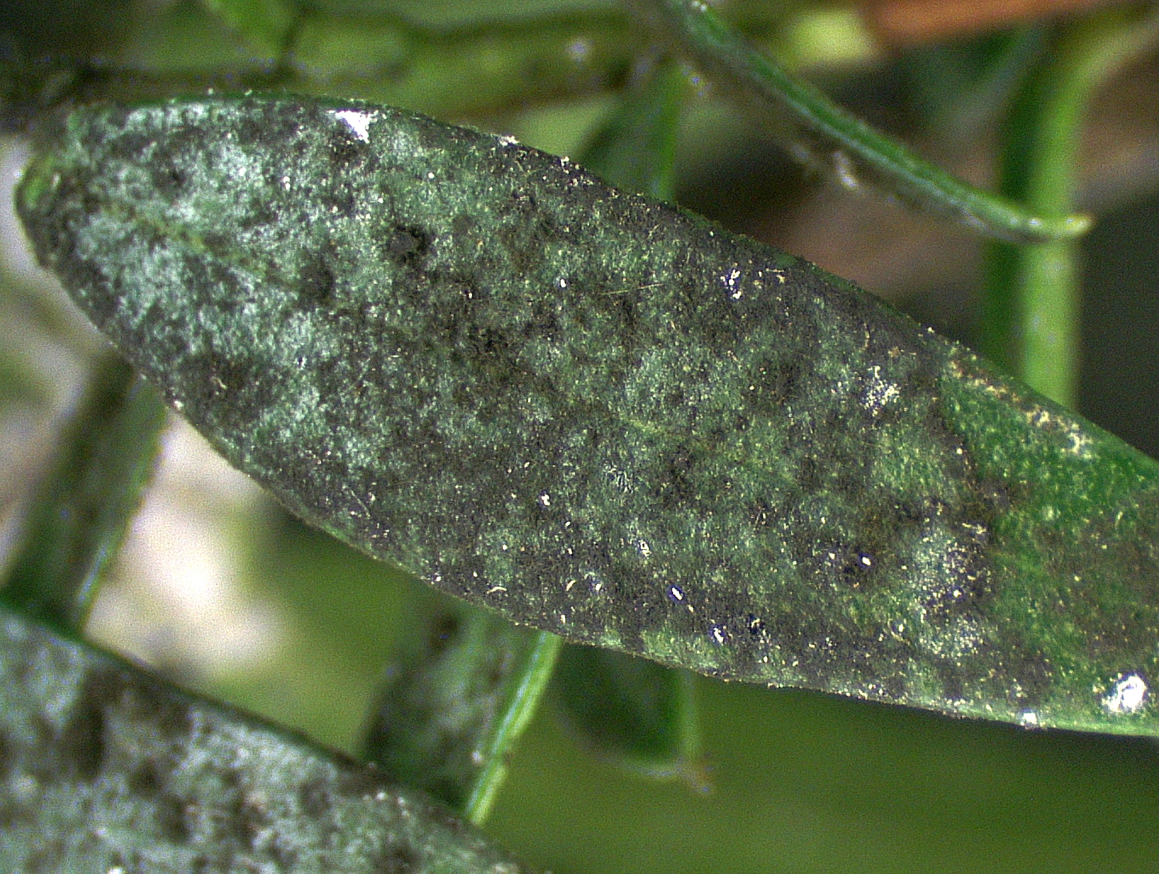Typisches Schadbild von Pseudococcus viburni. Durch Wachsausscheidungen sowie der Ansiedelung von Schwärzepilzen kommt es zu einer deutlich erkennbaren Verschmutzung der Pflanze. Foto: Olaf Zimmermann/LTZ