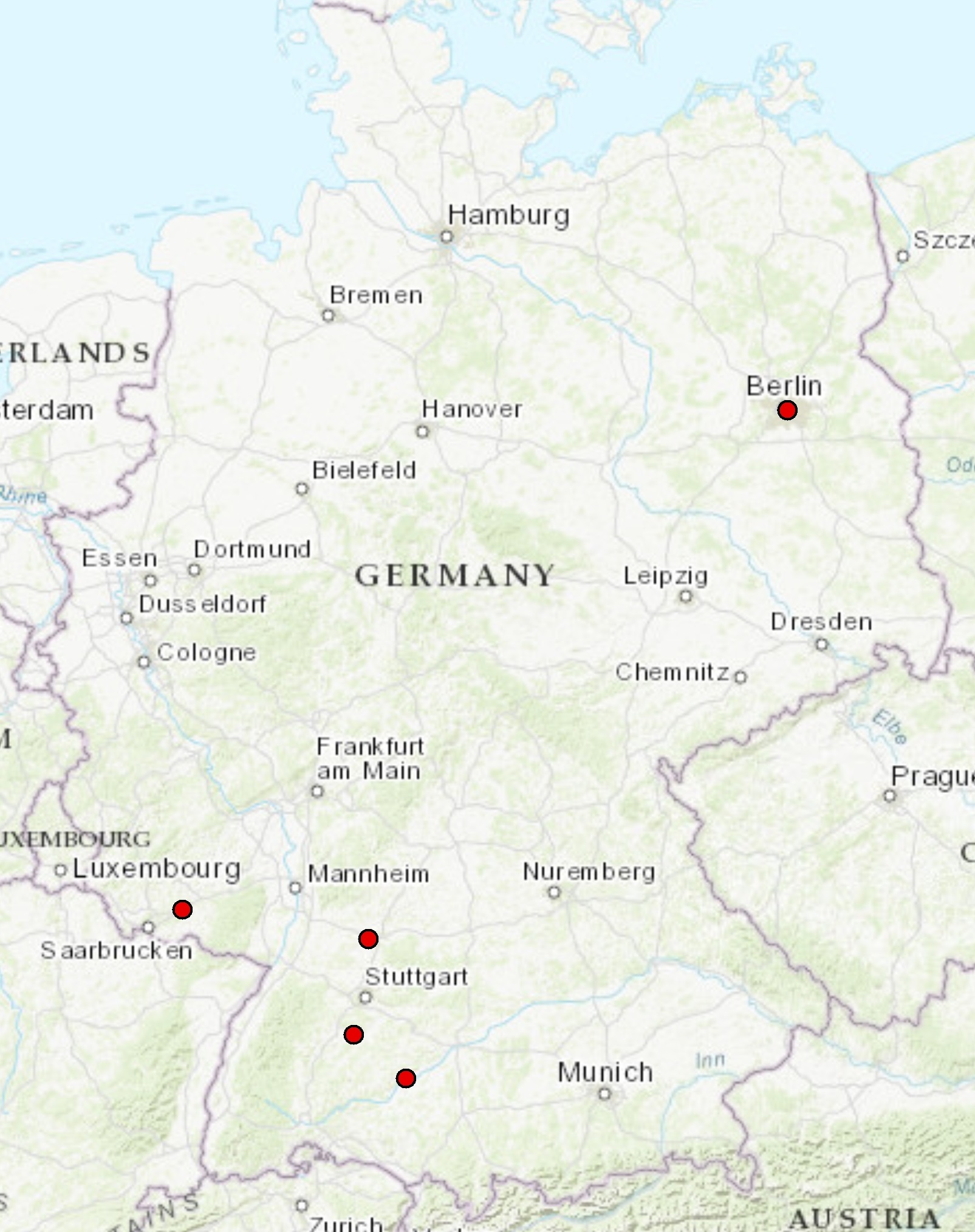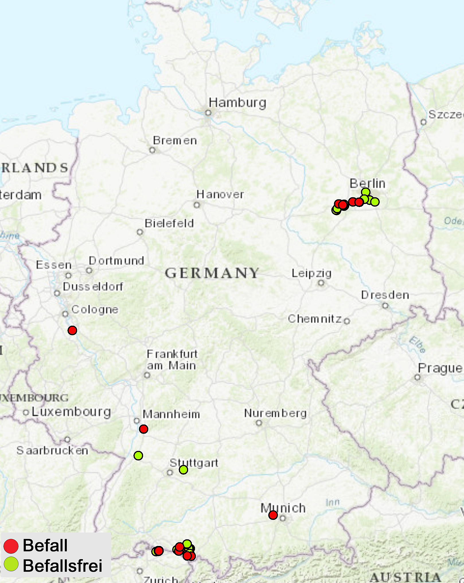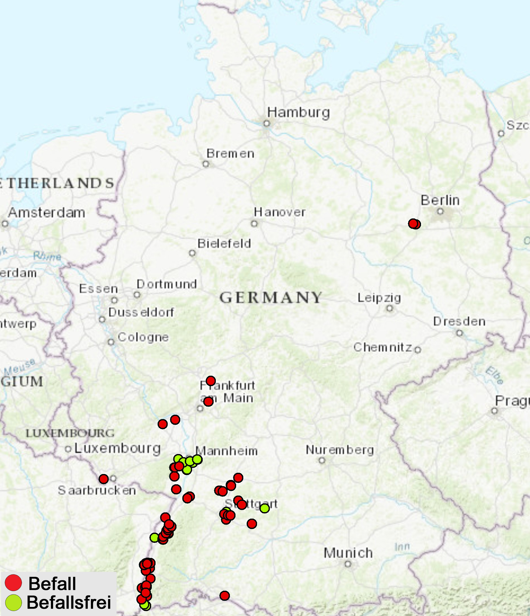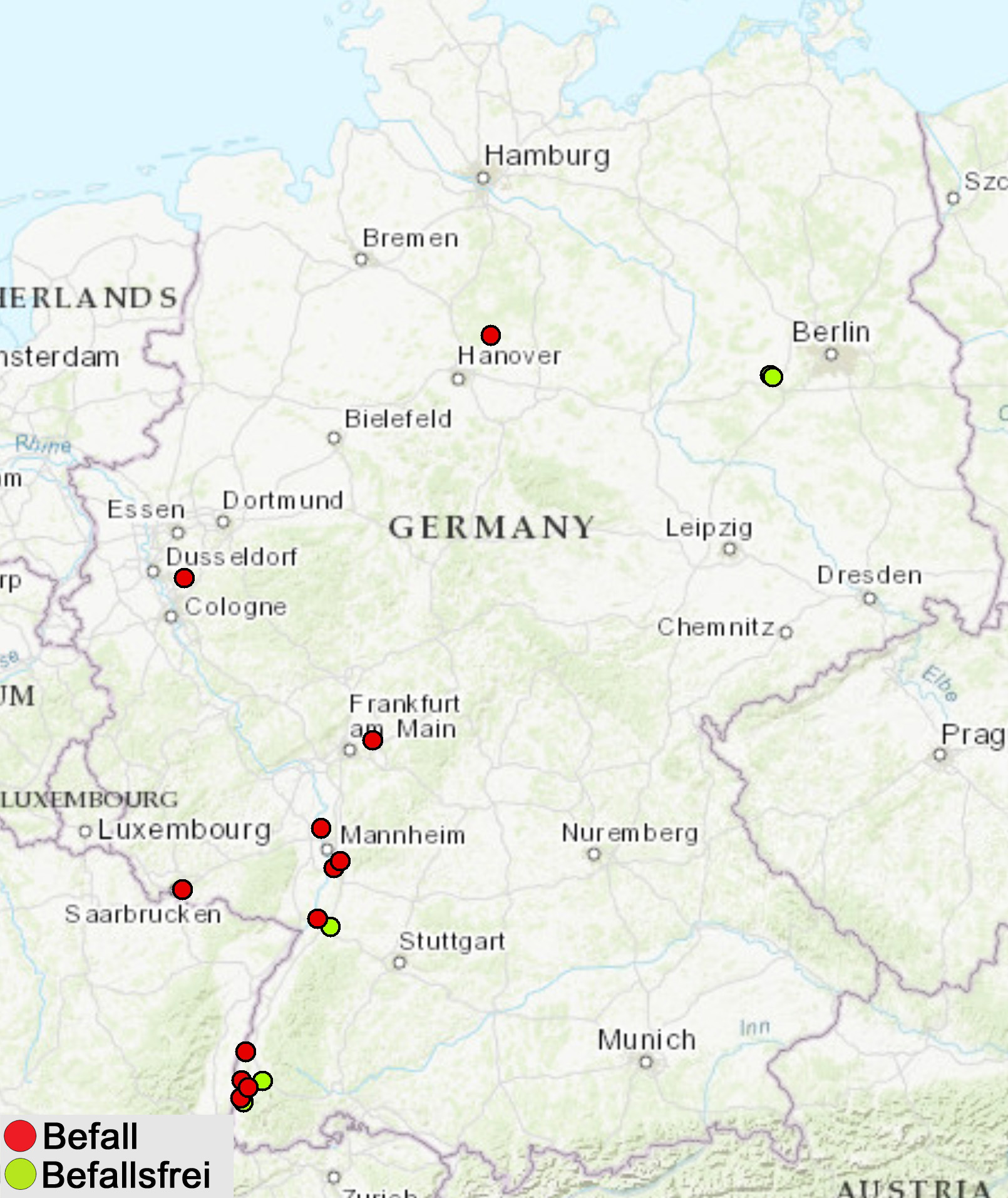 Legende: Roter Punkt = Befall