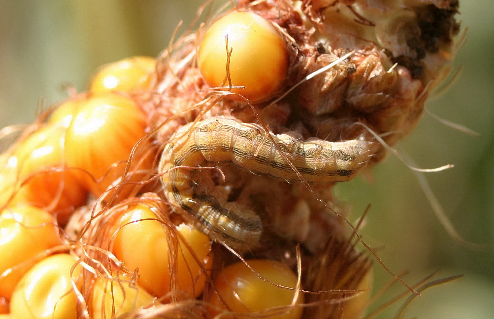Helicoverpa armigera - Fraß der Raupe an Mais. Foto: Sándor Keszthelyi (Universität Kaposvár)