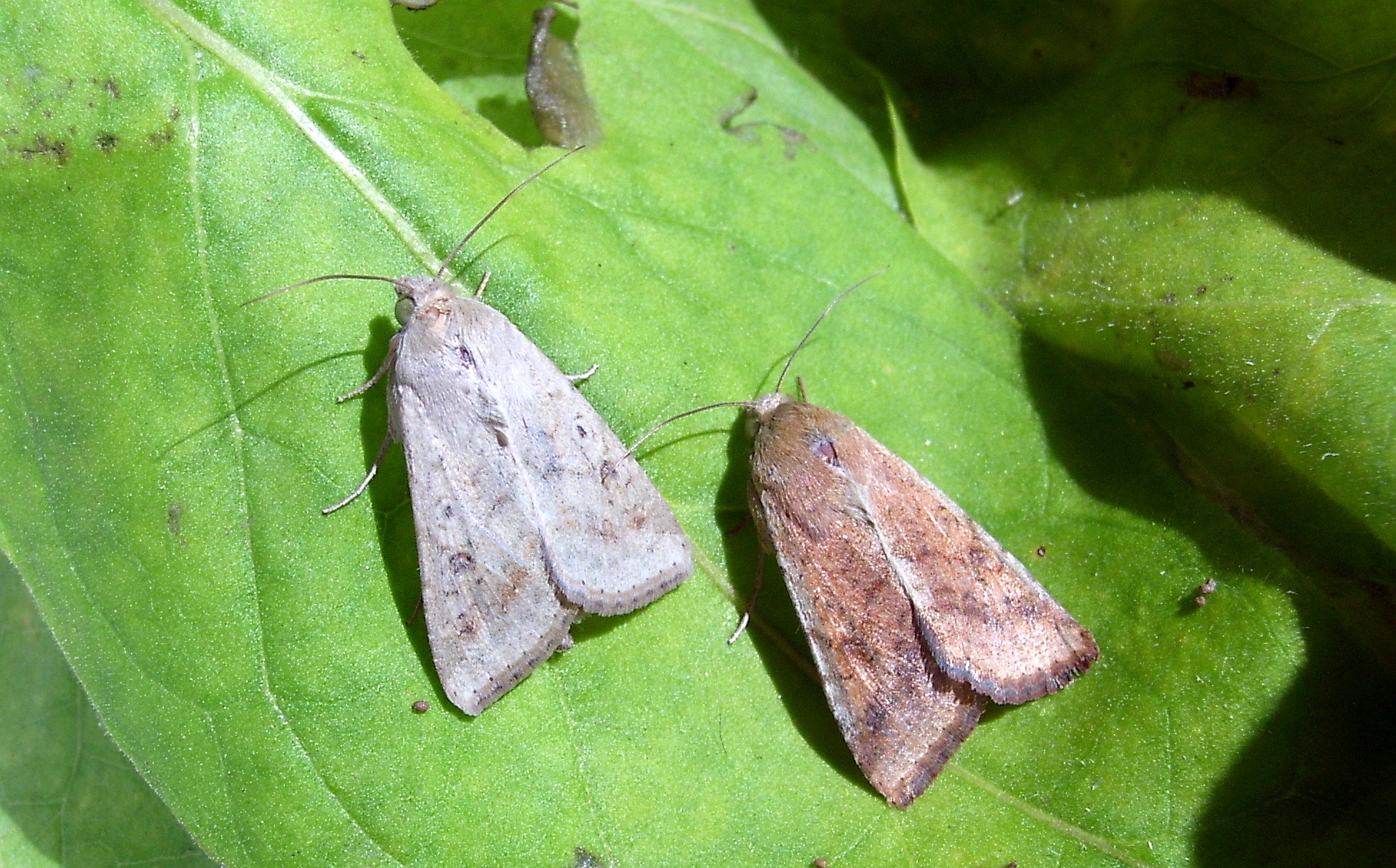 Helicoverpa armigera - Adultes Männchen (links) und Weibchen (rechts). Foto: Olaf Zimmermann/LTZ