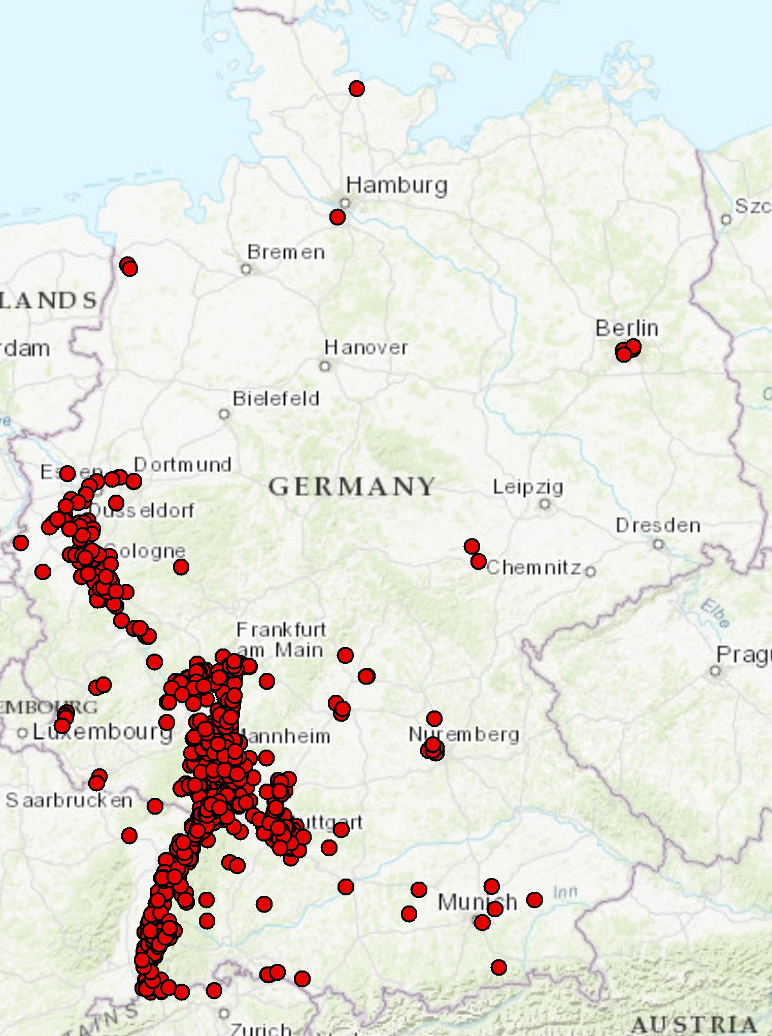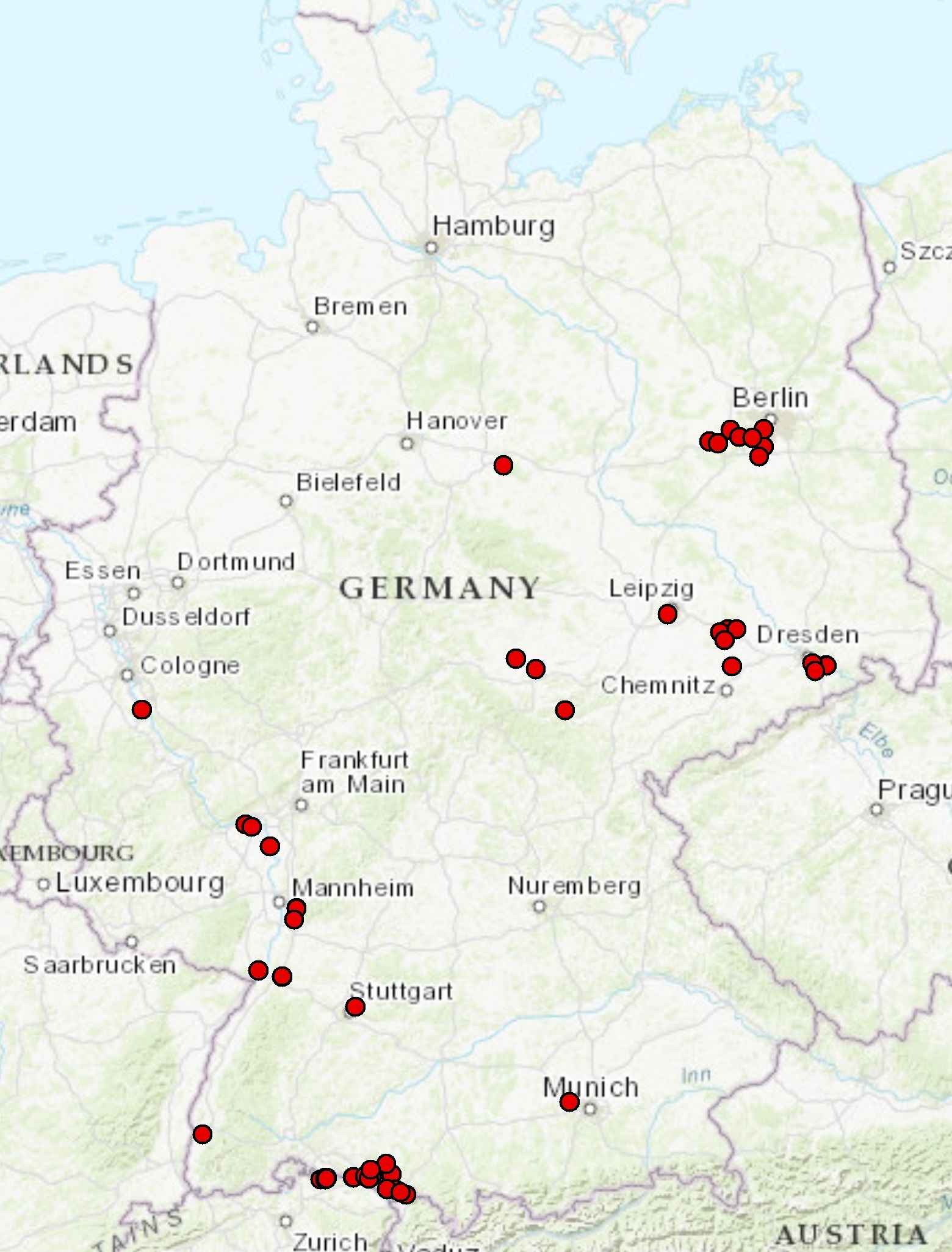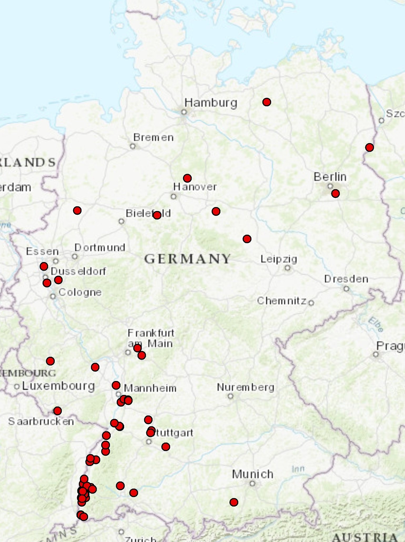 Bisherige Fundorte von Pseudococcus viburni in Deutschland. Zum Teil konnte Befall getilgt werden. Es ist zudem sehr wahrscheinlich, dass die Mehrheit der Einschleppungen nicht erkannt wird. (Stand: 01/2022)